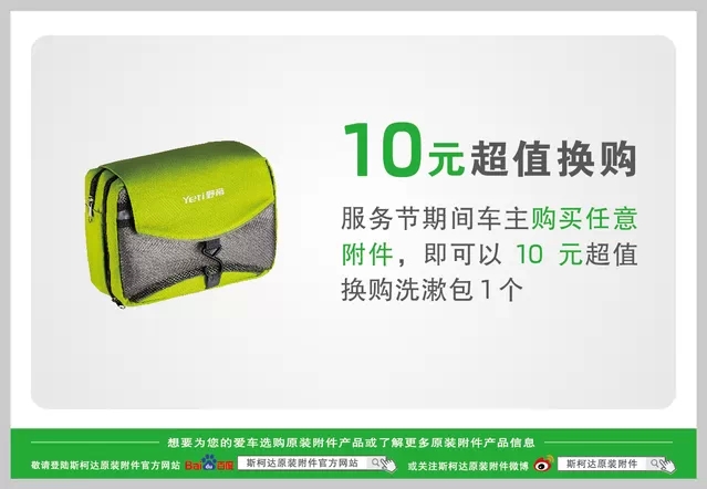 2014斯柯達服務節正在火熱進行中!4月20日至5月5日活動期間,在斯柯達原裝附件在線商城購買任意附件,只需10元即可超值換購洗漱包一個。